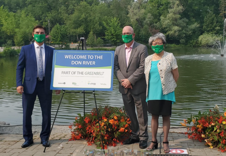 MPP Daisy Wai, Richmond Hill, joined Steve Clark, Minister of Municipal Affairs and Housing, Edward McDonnell, CEO of the Greenbelt Foundation, and Joe DiPaola, Acting Mayor, City of Richmond Hill and Board Member of Toronto and Region Conservation Authority, On July 20, 2021, to unveil a new sign recognizing the Don River as a protected urban river valley within the Greenbelt.